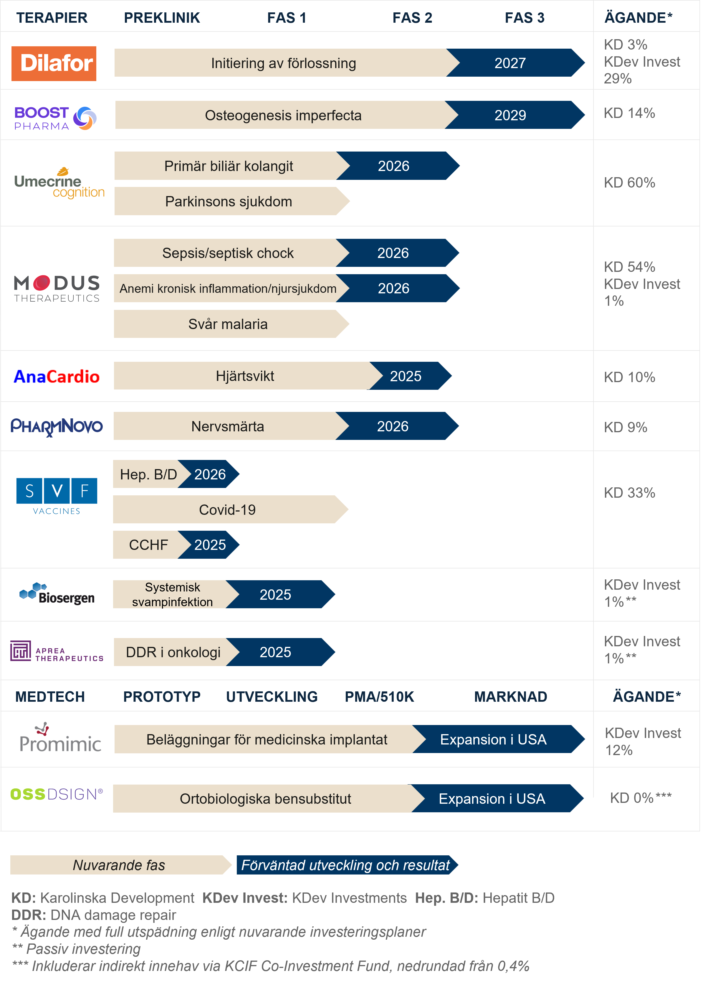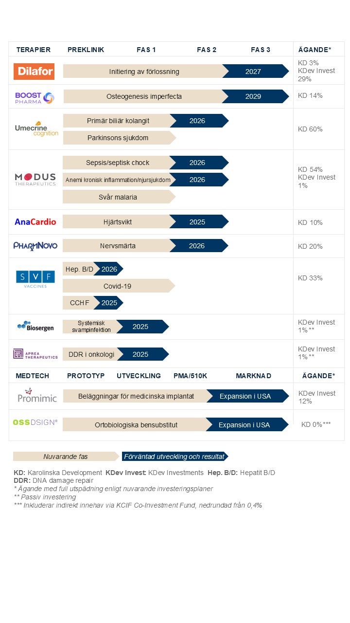 Karolinska Development har en fokuserad portfölj bestående av läkemedels- och medicintekniska bolag med betydande möjligheter till värdeskapande. Portföljbolagen utvecklar högt differentierade och kommersiellt attraktiva produkter med potential att leverera både övertygande kliniska och hälsoekonomiska fördelar, liksom attraktiv avkastning.